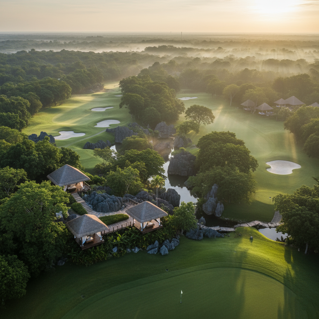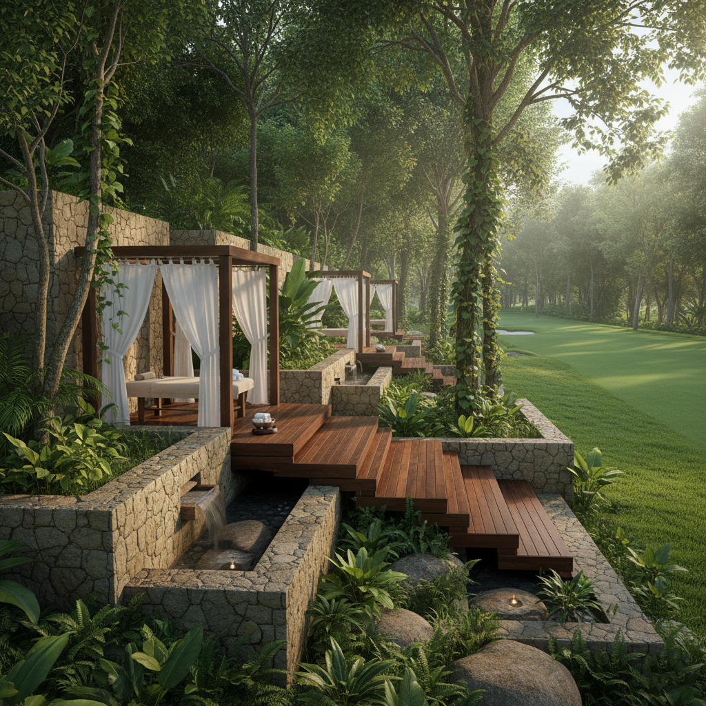 Los espacios se diseñan para fundirse con la selva. Clubhouses abiertos, terrazas de piedra caliza y senderos de madera conectan el green con los spas al aire libre. Cada rincón busca el mismo objetivo: permitir que el cuerpo y la mente se expandan. Aquí, la arquitectura no encierra, acompaña.
